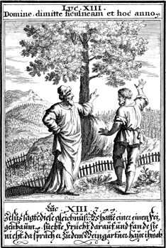 Description: The owner of the vineyard wants to cut down the fig tree that bears no fruit, but the servant urges him to wait one more year.