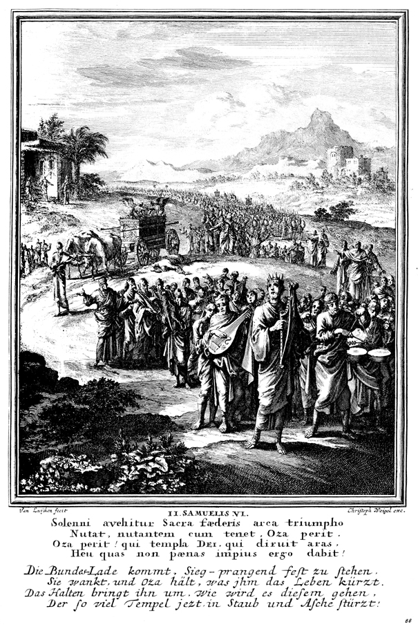 Description: As David brings the ark of God into Jerusalem on a cart driven by oxen, Uzzah touched the ark to steady it; as a result, the Lord struck down Uzzah, and David was angry and afraid to keep the ark.