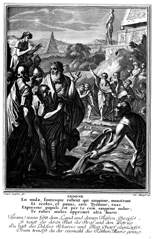 Description: Pharaoh turns away with a dismissive gesture, as Moses raises his staff over the Nile River to turn its waters into blood. Dead fish and a crocodile can be seen floating in the river.