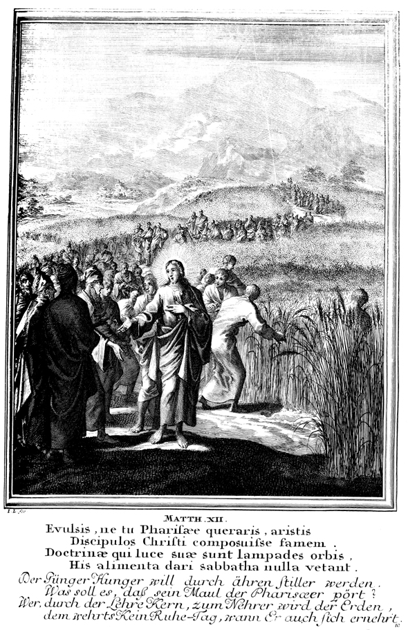 Description: The Pharisees question Jesus about allowing his disciples to pick grain on the Sabbath.