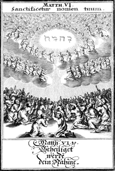Description: The divine name is depicted in light as God is worshiped on heaven and earth. This illustrates the petition "Hallowed be thy name" in the Lord's Prayer.