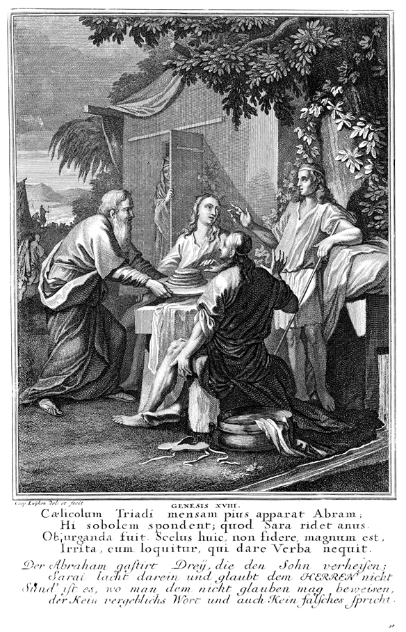 Description: Abraham serves the three angels a meal beneath the great tree of Mamre, and Sarah stands in the doorway listening, as the angels inform Abraham of God’s plan to bless him with a son through Sarah. The name of the artist (Caspar Luyken, 1672-1708), is located at the lower left corner.