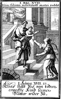 Description: Elijah hands back the child to the widow of Zarephath after reviving him from the dead.