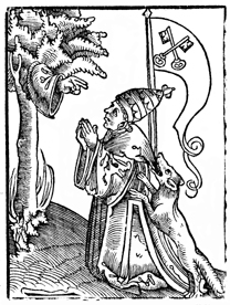 Description: The Pope is attacked by a fox as he prays to a tree with a hand coming out of it. Representation of the papal count.
