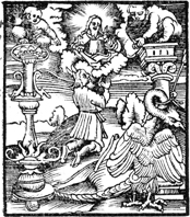 Description: An initial letter U with God in the clouds, flanked by decorative cherubs on columns and Moses kneeling before Him.