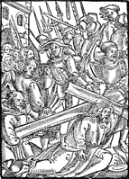 Description: Jesus Christ collapses under the weight of the cross, is helped by Simon of Cyrene, and is surrounded by a crowd and armed guards; Jerusalem is in the background..