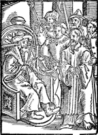Description: Surrounded by guards, Jesus Christ is brought before Pilate, who sits on a throne with scepter in hand..