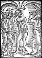 Description: Jesus Christ is bound to a pillar and beaten by three guards..