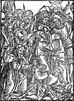 Description: Leading out a group of armed guards with torches, Judas Iscariot betrays Jesus Christ with a kiss; Simon Peter stands with sword raised above one of the guards, who kneels on the ground with his lantern..
