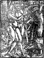 Description: Eve receives from the serpent a piece of forbidden fruit and then shares it with her husband, Adam.
