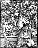 Description: The Deposition. The body of Jesus is laid into a coffin by Joseph of Arimathea with women and others looking on.