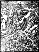 Description: Christ reigns from Heaven with putti on either side with their trumpets; a sword and an Easter lily are on each side of his head; worshipping below him are a man and a woman; and at the bottom of the panel are the maw of Hell on his left, and a bright light on the left, with a few walking toward the latter accompanied by angels but many more herded by demons toward Hell.