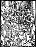 Description: Being held by a priest, Jesus is circumcised in the Jerusalem temple.