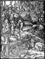 Description: Jesus Christ is laid out on the cross by soldiers who drive the nails into his body, as Jesus' mother and disciples look on. The nails and other instruments are in the foreground and the "INRI" inscription ready to be affixed to the cross.