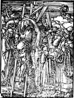 Description: Jesus Christ is brought down from the cross. The "INRI" inscription is visible over his head; the crown of thorns is left on the crossbeam on the right; and a ladder is used for the process. Jesus' disciples look on, and Joseph of Arimathea stands at the foot of the cross.
