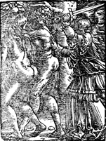 Description: Adam and Eve are expelled from the Garden of Eden by an angel after eating from the tree of the knowledge of good and evil.