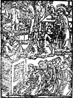Description: This scene of Christian worship shows a baptism, a preacher in a pulpit before the kneeling congregation, and the Eucharist being observed.