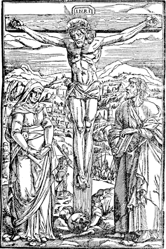 Description: This woodcut of the crucifixion of Jesus shows his mother Mary and the disciple John (his attribute, the book, in hand) looking on with the Roman soldiers and Jerusalem in the background. It represents the second section of the Apostle's Creed. It was one of several illustrations in Michael Helding’s Roman Catholic catechism. Moderate Catholic suffragan bishop of Mainz, and later postulate bishop (by Emperor Charles V) of Merseburg, Helding was a key figure in developing the Augsburg Interim..
