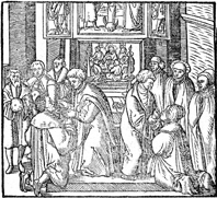 Description: Locus 12, end of part II. Eucharist/communion is offered in both kinds to worshippers, men on the left and women on the right. In the background is a painting of the Last Supper, and overhead is the lower part of a triptych, with the crucifixion scene in the middle panel..
