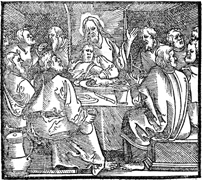 Description: Beg. Of Locus Pt.12 - De Sacramentis. Jesus and disciples share the Last Supper (Passover meal) together. The Apostle John leans on Jesus' chest, and Judas Iscariot with money bag in hand sits across the table from Jesus..