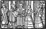 Description: Beg. Of Locus Pt. 15 - De Matrimonio. Inside a church building, a Protestant preacher joins the hands of a man (with one attendant) and a woman (with three attendants) together in a marriage ceremony..