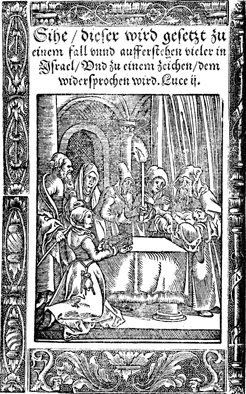 Description: When Jesus was presented by his parents in the temple with two birds for sacrifice, the righteous Simeon offered a blessing and the prophetess Anna a prayer of thanksgiving. The artist of this engraving is the Monogrammist HA.
