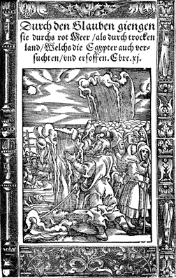Description: The waves cover over the Egyptians as the Israelites cross the Red (Reed) Sea on dry land. The artist of this engraving is the Monogrammist HA.
