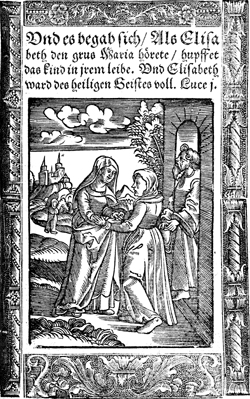 Description: Mary visits Elizabeth and Zechariah after finding out they are both pregnant. The artist of this engraving is the Monogrammist HA.