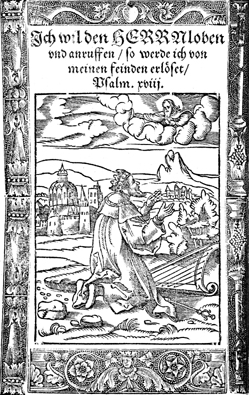 Description: King David, with harp on the ground before him, kneels in the countryside (city in the distance) and looks towards God in the clouds. The artist of this engraving is the Monogrammist HA.