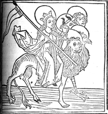 Description: A crowned woman, with a flag in one hand cup in the other, rides a four-headed (lion, eagle, bull, man) beast. Each foot of the beast corresponds to a head.