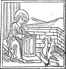 Description: John writes his gospel with his attribute, the eagle, nearby.