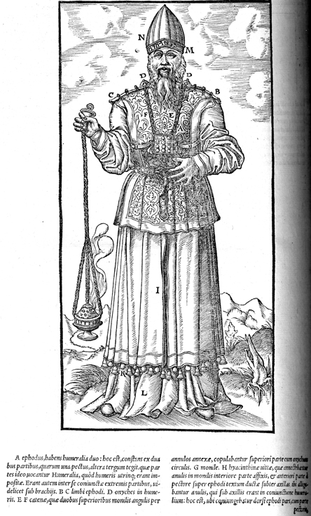 Description: Here Aaron appears in priestly garments with an incense burner in hand.