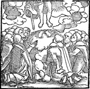 Description: The Ascension of the Lord, only see his legs as he rises into clouds, several men looking up at him.