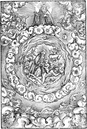 Description: God and the hosts of heaven looking down into creation, through a vortex-like portal - God is pulling Eve out Adam's side; very intricate piece.
