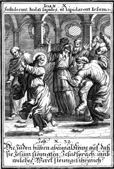 Description: Jesus is accused of blasphemy by his Jewish opponents and narrowly escapes stoning .