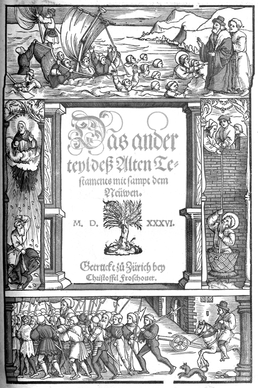 Description: Historiated title-page border with a series of scenes from the life of the Apostle Paul: Paul has a vision of Christ and struck blind on his road to Damascus; after his ship is wrecked, Paul swims safely to shore; Paul is lowered in a basket over the city wall of Damascus; and Paul is arrested and led off in a crowd of soldiers with a cannon and horseman in the background.