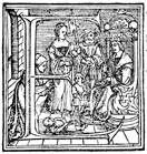 Description: In this initial letter "E" Solomon sits on his throne with scepter in hand and judges the competing claims of two women for the one child before him; a guard with pike in hand stands nearby..