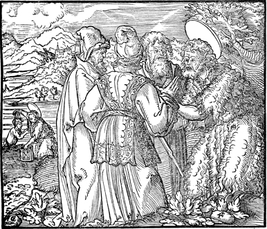 Description: John the Baptist teaches and baptizes. The 4-cross is placed in the lower right.
