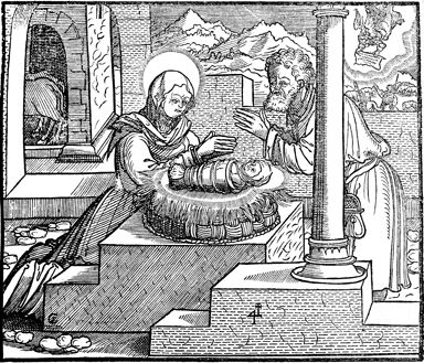 Description: Jesus is born in Bethlehem, as shepherd learn of his birth from an angel. The engraver's knife and monogram (CE) are placed in the lower left corner, and the 4-cross in the lower center.