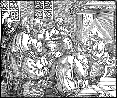 Description: Mary and Joseph find the twelve-year-old Jesus in the temple, sitting among the teachers, listening and asking questions. The engraver's knife and monogram (CE) are placed in the lower right and the 4-cross in the lower left corner.