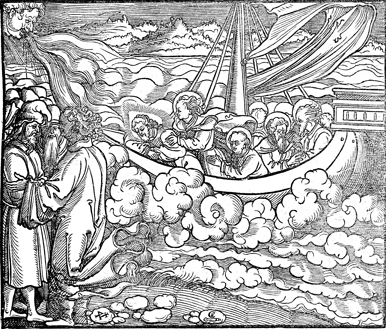 Description: Jesus' disciples attempt to wake him as he sleeps in the boat during a storm. The engraver's knife and monogram (CE) are placed in the lower center and the 4-cross in the lower left.