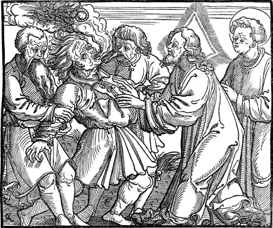 Description: Jesus casts out a demon, enabling a mute man to speak. The engraver's knife and monogram (CE) are placed in the lower left and the 4-cross in the lower center.