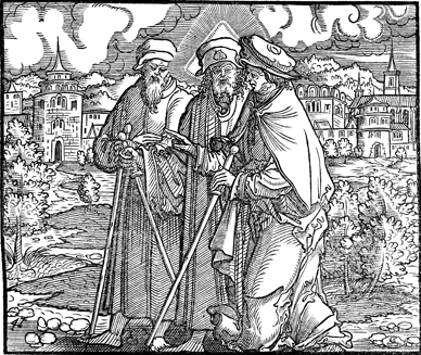 Description: Jesus converses with Cleopas and another disciple on the road to Emmaus. The engraver's knife and monogram (CE) are placed in the bottom right corner and the 4-cross is in the lower left.