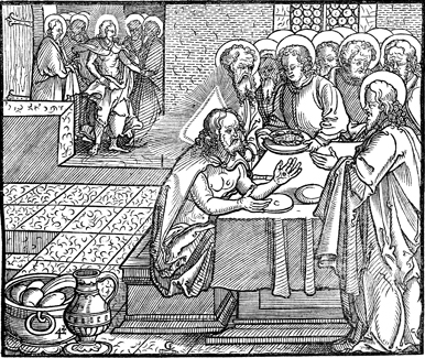 Description: Jesus appears to his disciples following his resurrection. In the foreground, he is served a piece of broiled fish. The engraver's knife and monogram (CE) are placed in the bottom center and the 4-cross is in the lower left.
