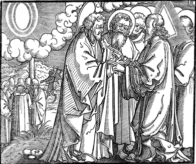 Description: Jesus stands and teaches the disciples, while in the background a group of men huddle together as the devil approaches them. The engraver's knife and monogram (CE) are placed in the upper right center and the 4-cross is in the lower left.