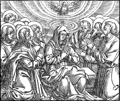 Description: At Pentecost the Holy Spirit descends on Jesus’ disciples, who are gathered around Mary.