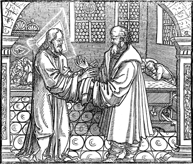 Description: Jesus converses with Nicodemus about being born again. In the background, Jesus is baptized by John the Baptist in the Jordan River. The engraver's knife and monogram (CE) are placed in the upper right and the 4-cross is in the upper left.