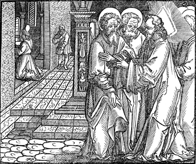 Description: Jesus speaks of a Pharisee and a tax collector praying in the temple. The engraver's knife and monogram (CE) are placed in the lower left and the 4-cross is in the lower left corner.