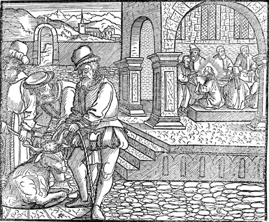 Description: Jesus heals a man with dropsy while eating dinner at a Pharisee's house on the Sabbath; outside, an ox is removed from a pit. The engraver's knife and monogram (CE) are placed in the lower right and the 4-cross is in the lower left.