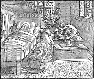 Description: As Mary and Jesus sleep, Gabriel comes to Joseph to warn him to flee to Egypt with his family in order to escape Herod's plot to slay infant Jewish males. The engraver's knife and monogram (CE) are placed in the lower left corner, and the 4-cross in the lower right.